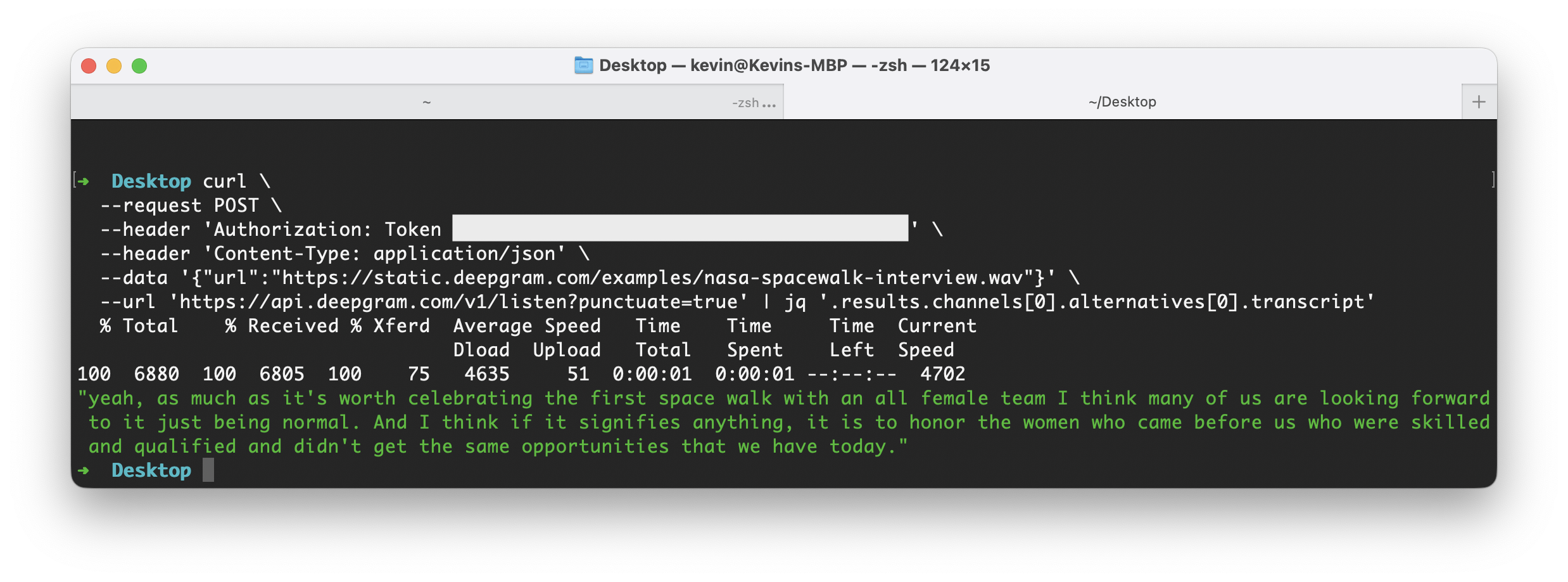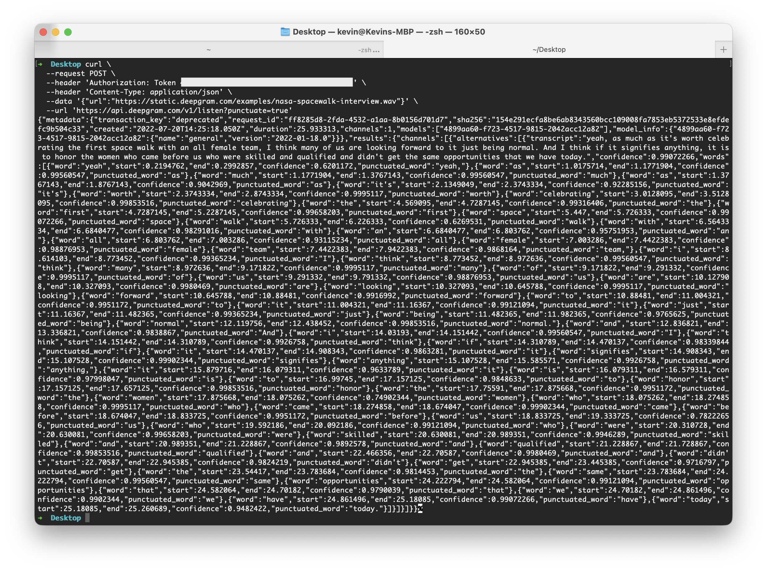 --request POST: An HTTP request with the POST method.--header 'Authorization: Token YOUR_DEEPGRAM_API_KEY': Includes authorization details and links the request with your Deepgram account and Project.--header 'Content-Type: application/json': JSON data that will be sent with this request.--data '{"url":"<https://static.deepgram.com/examples/nasa-spacewalk-interview.wav>"}': JSON data sent to Deepgram (an object containing one URL parameter).--url 'https://api.deepgram.com/v1/listen?punctuate=true': URL to which the request should be made (Deepgram’s endpoint).punctuate=trueenables the punctuation feature.\: Allows you to break one command over several lines for readability.