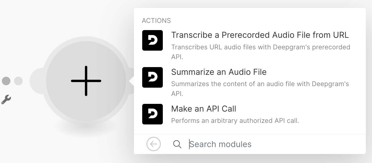 To add a Deepgram action, click on the “Add another module” button. Type Deepgram and then select the appropriate action. This will bring up all the possible Deepgram actions