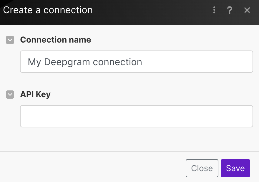 Next you will be prompted to connect to Deepgram. Enter your API key to connect your account.