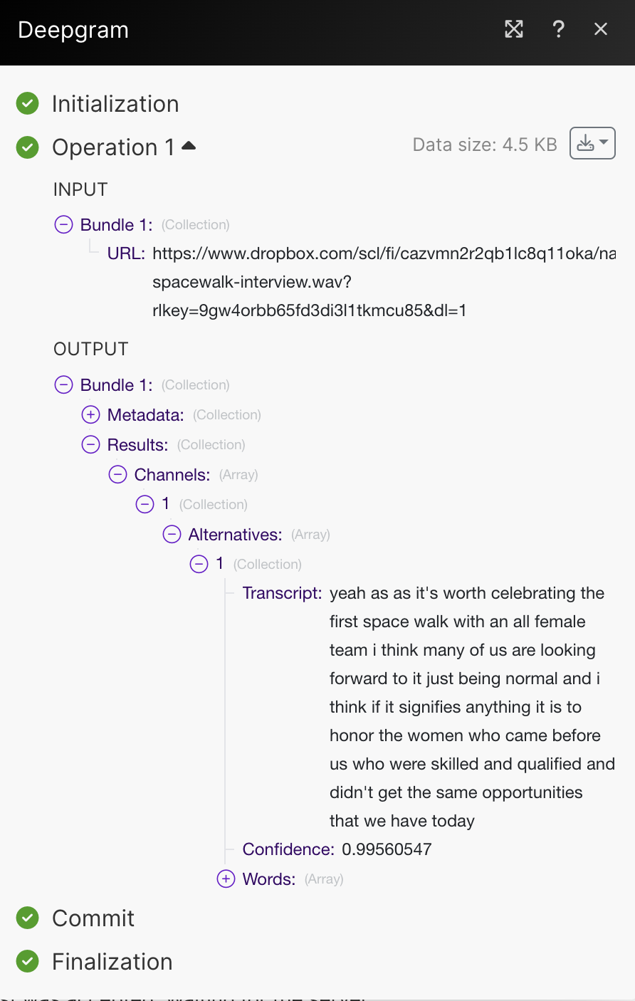 Add an audio file to a folder in Dropbox (Trigger) -> Create a shareable URL Link of the file in Dropbox (Action) -> Transcribe the file with Deepgram (Action) -> Add a text file with the transcription to another folder in Dropbox (Action).