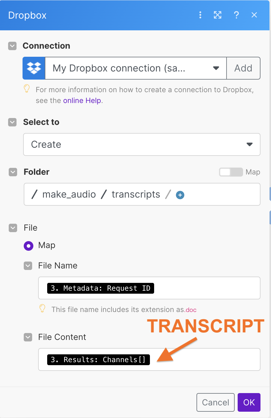 Choose Results: Channels[] to use the transcript output in this following action.