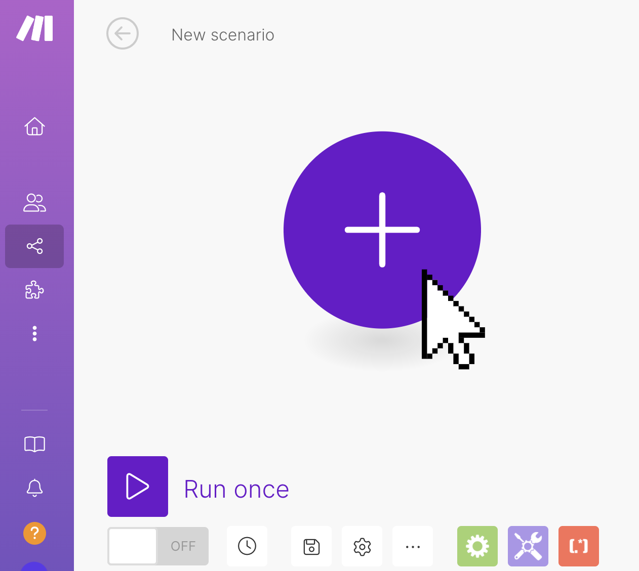 Click on the plus sign to add a trigger. A scenario must start with a trigger. The trigger starts off the workflow with an initial trigger event.