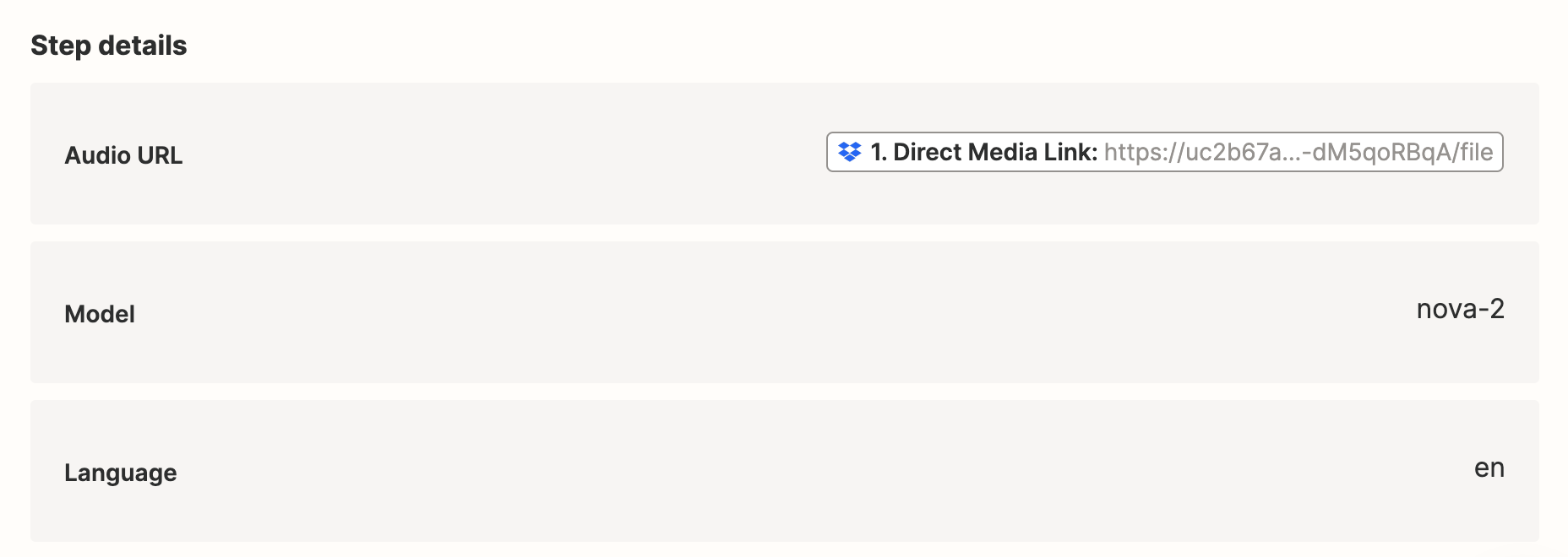 Deepgram’s Zapier integration only accepts a publicly accessible URL audio file. If you need to convert raw audio to a URL, we recommend using the Cloud Convert integration to convert the audio file to a URL.