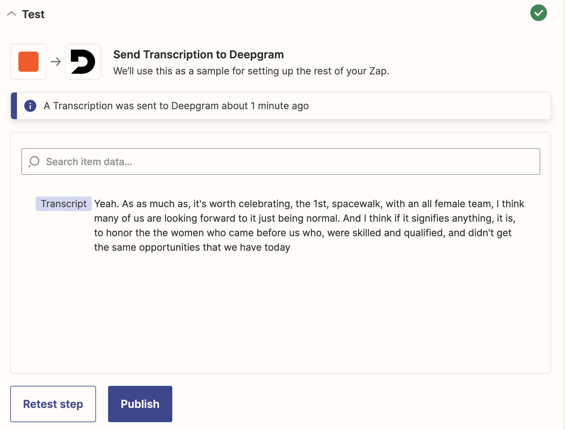 You can test the workflow by clicking “Test Step”. This will run the workflow, and then you should see a transcription response that looks similar to this: