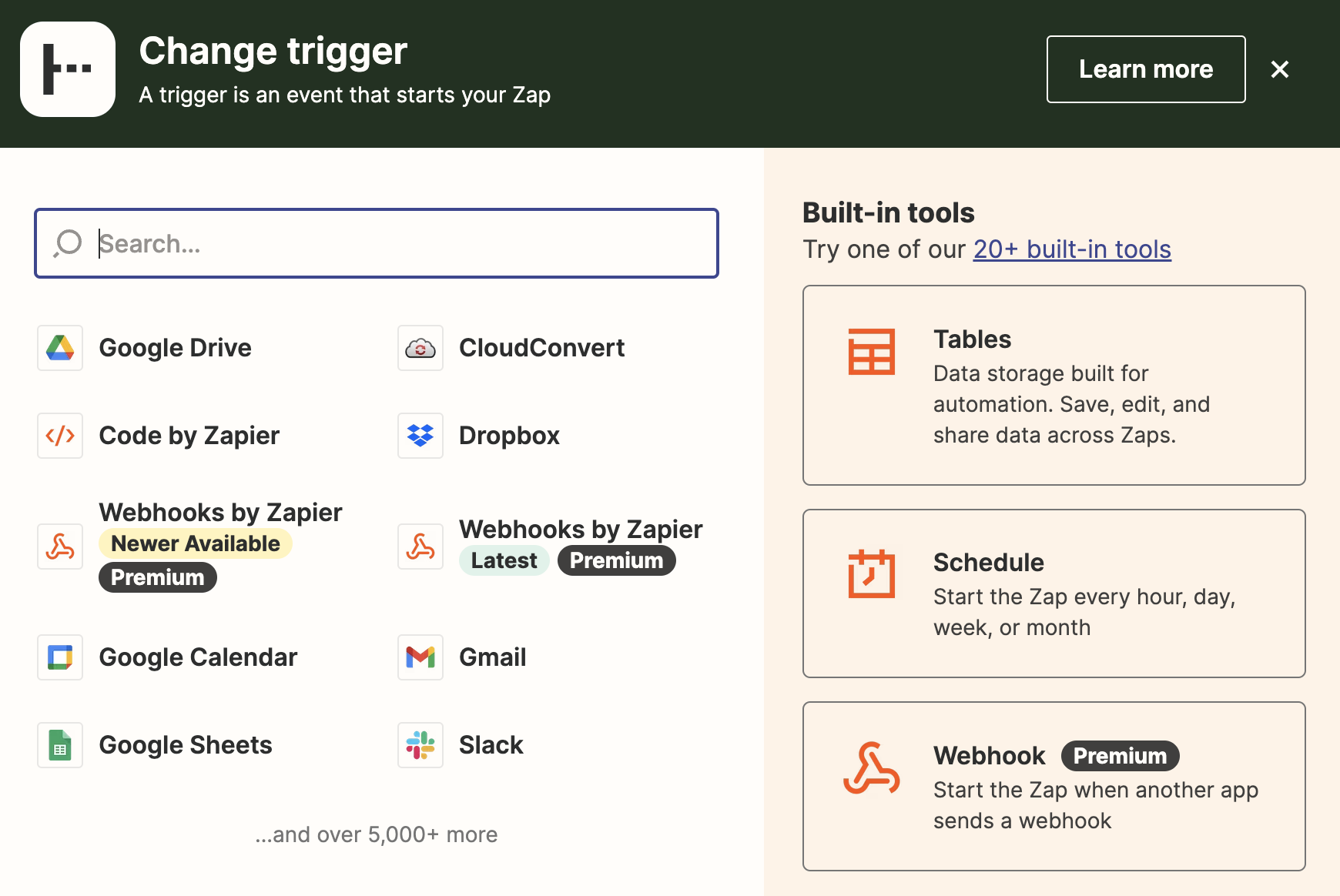 Click into the first box to change the trigger. A Zap must start with a trigger. The trigger starts off the workflow with an initial trigger event.